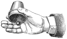 This trick may be performed by any of our readers without having the slightest introduction to the beings of another world. He has only to procure a small tube, place it in the valve-hole of the accordion, breath and blow into it alternately, and then by fingering the keys he will be able to produce precisely the same effect as our friends the mediums. In order to touch distant persons, or to make such things as guitars and tambourines play at different parts of the room, he has to conceal about him, or have hidden in some recess in the table or chair, a telescopic rod, extending several feet. To the end of this he fixes the tambourine or guitar, on the surface of which has554 been placed some phosphorus, and by waving the stick he makes it appear as if persons were floating over the heads of the company. The invisible hand is formed by a glove being fastened to the end of the tube. The glove is inflated or blown out through the tube, and when slapped on to the cheek of a person it has all the sensations of a cold hand striking the face. The glove covered with phosphorus and waved about is the mysterious hand, without any body, which caused so many to believe that a spirit was present.
