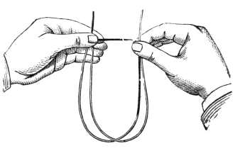 Now, had these faithful believers looked very carefully at the rope and the method of the tying, they would have discovered that the rope had previously been cut in halves, and then knotted with a fast knot in the middle. This knot is concealed by the medium before he binds himself, by holding it in his hand. The rope then, of course, looks like one continuous whole. When the gas is lowered, he places the two ends of the rope beneath him on the chair, and, in a manner which I can scarcely explain in writing or even by illustration, so binds himself, that by making a double running knot, and placing this double noose twice round his wrist, he can slip it, and thus free his hand at will. The knot may be concealed, because it is never touched or disturbed. When the room is again darkened, it is found to be a very easy matter for the medium to perform any of the usual manifestations.