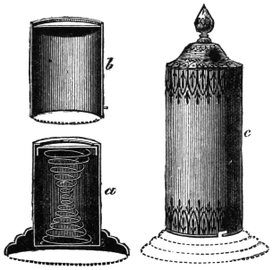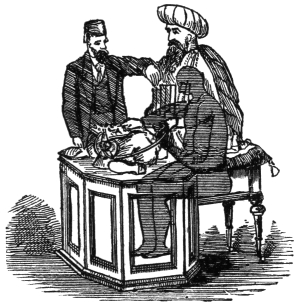 Again, the medium asks a gentleman to put the hands of a watch to any hour he chooses, and, when again the lights are lowered, he calls out the exact time to the exact minute. This all seems very mysterious and unaccountable, but I shall again show that we do not require spirit aid to perform these marvels. The medium has in his pocket a small phial containing phosphorus and oil; and when this test is performed there is invariably a long cloth on the table. When the papers upon which the sentence or figures are written, or the watch, are placed on the table, the lights are lowered, and the performer stoops beneath the table, takes the paper or watch, opens the phial, from which a blue flame is emitted, and by this light he reads the sentence, or figures, or sees the time.557 He replaces the articles, and can, of course, readily tell what he has read or seen.