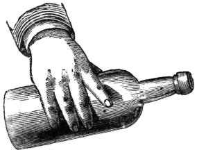 VII. Bautier’s Great Ink-and-Water Trick.—This trick, first introduced by Bautier, at the Egyptian Hall, London, has, to the best of my belief, never before been explained. It is a remarkably clever deception, and, when dexterously performed, defies detection. It consists in showing a decanter filled with ink and another with water, and while each decanter is held by one of the audience, making the contents of each change places, the ink going into the one containing water, while the pure liquid is found in the one in which the ink was seen. Take two water bottles or decanters, and in one place a tassel of black fleecy wool, just long enough to touch the bottom of the bottle. The tassel must be tied by a knot at the top, and a small piece of string just hanging over the mouth of the bottle, attached to the knot. Then fill the glass with water. The bottle thus prepared looks at a short distance like a bottle of ink, and you have only to tell your audience that it is so to make them believe it. This, I am afraid, is inculcating in the mind of the reader the principle of falsehood—at least Mrs. Grundy might say so; but a professor of magic is doing nothing but telling “crammers” from the commencement to the conclusion of his entertainment. Perhaps this is the reason why it is called the “black art,” and was the cause of so much persecution in the “good old days,” when all was so pure and so virtuous, as the lovers of the beaux temps would have us believe. But pardon this digression. In the other bottle place a weak solution of the proto-sulphate of iron, about a half ounce to about a pint and a half of water. Have ready a bit of pyrogallic acid—about two-thirds of a tea-spoonful, wrapped in a small piece of blotting-paper that has been blacked with ink. Having completed these arrangements, and asserted that you have on the table a bottle containing water and another ink, you borrow a handkerchief, with which you cover the bottle containing the clear solution, and in doing so you slip into it the pyrogallic acid; and in handing the bottle to one of the audience to hold you give the contents a little imperceptible shaking. You then take another handkerchief and place it over the other bottle, which you hand to a person to hold. You then command the contents of each bottle to change places. Then, in removing the handkerchief563 from the ink bottle, you clutch the piece of string and quickly pull out the black wool and throw the handkerchief out of sight, showing the bottle to contain only water. You then ask the person holding the other bottle to remove the covering, when the fluid will be found to be “as black as night.” This trick always causes the greatest astonishment.