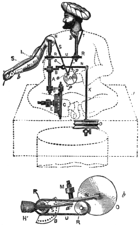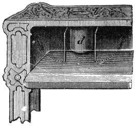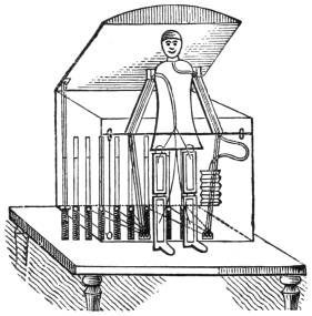 Another trick which has been performed by Messrs. Maskelyne and Cooke is that known as the spiritual musical box. An oblong piece of glass is suspended by means of four cords hanging from the ceiling, and upon this glass is placed a musical box. At the word of command the box begins to play, and when desired by the exhibitor or one of the audience, it suddenly ceases. The effect is really marvellous, but the secret of the trick is very simple. In the box there is placed a balance lever, which, when the glass is in the slightest degree tilted, arrests the fly-fan, and thus prevents the machinery from moving. When the performer gives the word of command, the glass is made level, and, the fly fan being released, the machinery moves, and a tune is played. When commanded to stop, the cord556 on either side is slightly pulled, the balance lever drops, the fly fan is arrested, and the music ceases.