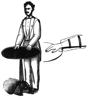 The floating table has often been performed, but I have never attempted to do this spiritual manifestation. The medium generally has with him an accomplice, and they bind to their arms a flat iron rod, which terminates toward the wrist in a kind of hook concealed from the company by the cuffs of the shirt. The medium contrives to slip this hook under the edge of the table, as does also his confederate who sits opposite, while the dupe is sitting between. The annexed illustration will show the iron rod, and the method of fitting it beneath the table.