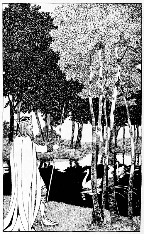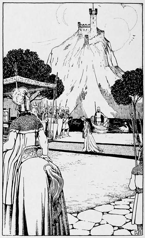 A cry of admiration arose from the crowd, as they turned toward the Rhine. There they saw a handsome knight, standing erect in a tiny skiff drawn by a swan. Spellbound they watched him. He sprang lightly ashore and sent the swan away.[119] It floated down the river and out of sight, giving forth its own beautiful, dreamy song.