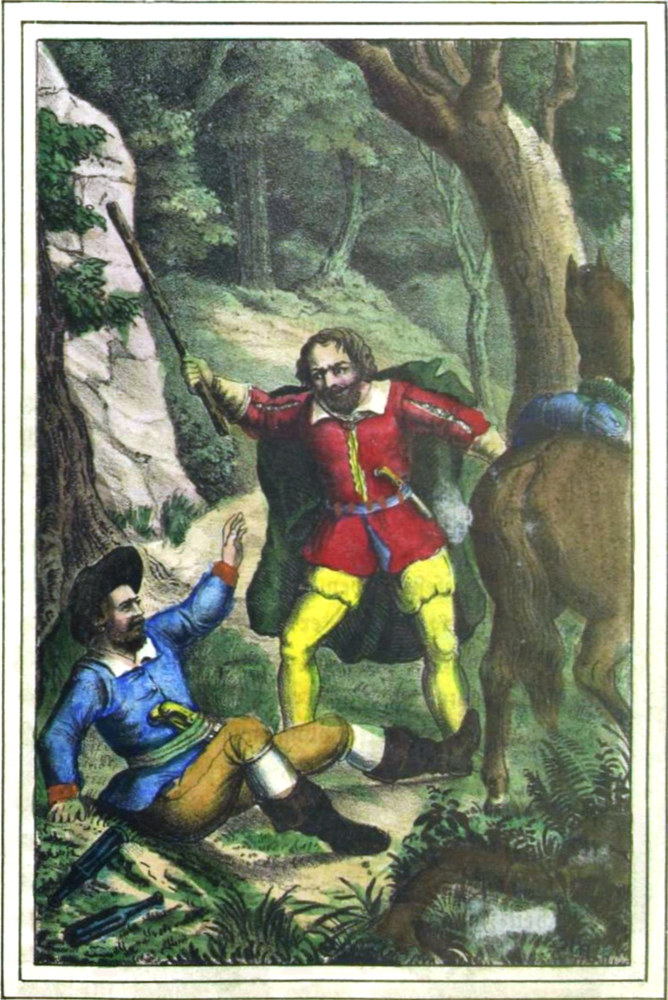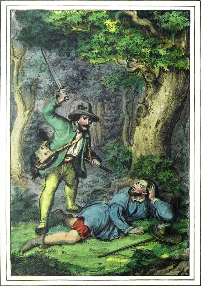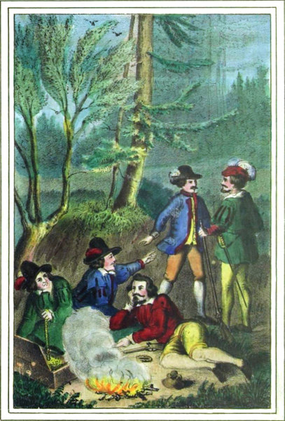 „Das Merkwürdigste aber ist bei diesen verfluchten Räubern,“ meinte einer von den Bauern, „daß sie sich unsichtbar machen können; denn wenn sie verfolgt werden, wenn die Soldaten ihnen auf der Spur sind, und sie bis in die Wälder treiben, da haben jene schon oft geglaubt: jetzt können uns[S. 4] diese Schufte nicht mehr entgehen, sie sind in unsrer Gewalt und wir liefern sie nun gebunden und in Ketten in die Gefängnisse ein — aber diese Hoffnung hat die Soldaten noch immer getäuscht, denn plötzlich, gleichsam vor ihren Augen, waren die Kerle verschwunden und die Soldaten hatten das leere Nachsehen und konnten dann sogar jedesmal zu ihrem größten Aerger nicht einmal eine Spur mehr von ihnen auffinden! —“