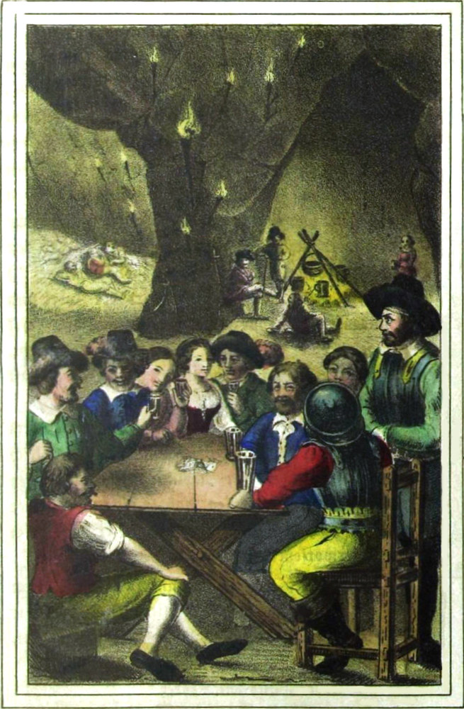 Eine Höhle, von Felsenwänden umschlossen und von sehr weitem Umfange, war von unzähligen Fackeln, die in den Felsenritzen steckten, erleuchtet. In der Mitte stand eine lange Tafel, an einer Wand hin lief ein hoch aufgeschichtetes Strohlager, über welchem Flinten, Säbel, Pistolen, Messer und Beile hingen. Ganz im Hintergrunde brannte ein Feuer, von Kochtöpfen umgeben. An der Tafel saßen mehrere Männer mit einigen sehr hübschen Dirnen, andere lagen auf dem Strohlager, andere bereiteten Speise.