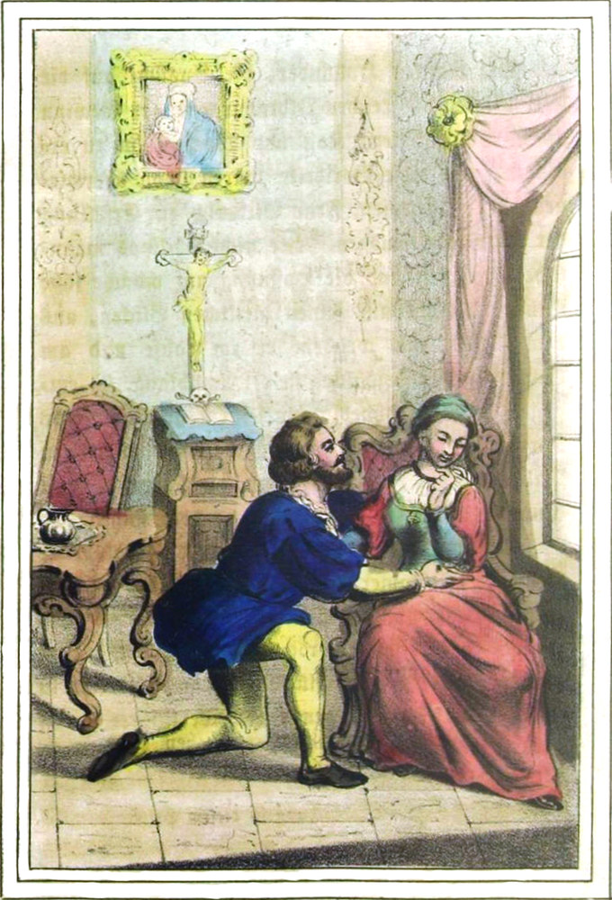 Rasch hob der Graf die Knieende empor, trug sie unter den süßesten Schmeichelworten auf das Sopha, setzte sich an ihre Seite, und bot nun alle Macht der Beredtsamkeit, alle Künste der Verführung auf, sie für seine Wünsche geneigt zu machen. Er überreichte ihr eine Urkunde, worin Josephine als die Herrin einer beträchtlichen Besitzung erklärt wurde, und betheuerte mit einem feierlichen Schwure, Philipp aus dem Gefängnisse zu entlassen und mit einer sehr reichen Summe nach dessen Vaterlande zu senden, wenn sie nur einige Jahre mit ihm als seine vertrauteste Freundin leben wolle. Die edle tugendhafte Frau wies jedes Geschenk, jede noch so lockende Zusicherung mit strengem Ernste zurück; sie flehte nur um die einzige Gnade, sie mit Philipp ohne alle Habe im allerdürftigsten Zustande dahin ziehen zu lassen, da sie an der Seite des geliebten Gatten das erbettelte Brod freudiger genieße, als die leckersten Gerichte im verbrecherischen Wohlleben.