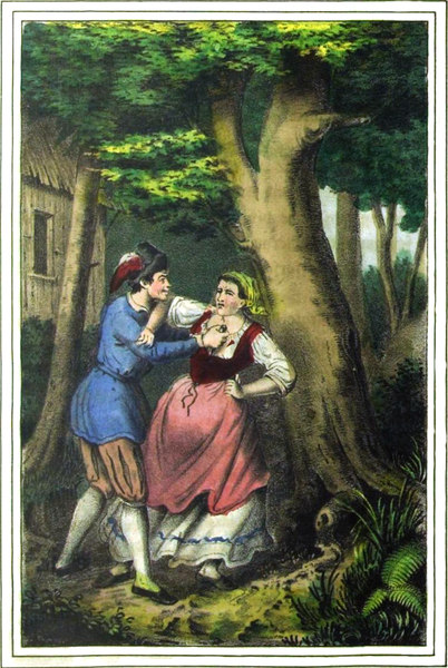 „Fasse Dich. Ich bin Josephine, Dein treues Weib, das gekommen ist, Dich zu retten. Laß uns von dannen eilen!“ — flüsterte sie dem Zitternden zu, der seine Sinne noch nicht ganz gesammelt und noch nicht klar aufgefaßt hatte, was da geschehe.[S. 427] Josephine wiederholte ihre Worte, sie beschwor ihn, keinen Augenblick zu versäumen; mit kräftiger Hand zog sie ihn von der Erde empor, und als der Morgen anbrach, waren beide schon viele Meilen vom gräflichen Schlosse entfernt und eine Gebirgsschlucht, von himmelhohen Tannen dicht umgürtet, gab für den ersten Augenblick den Flüchtigen eine sichere Freistätte.