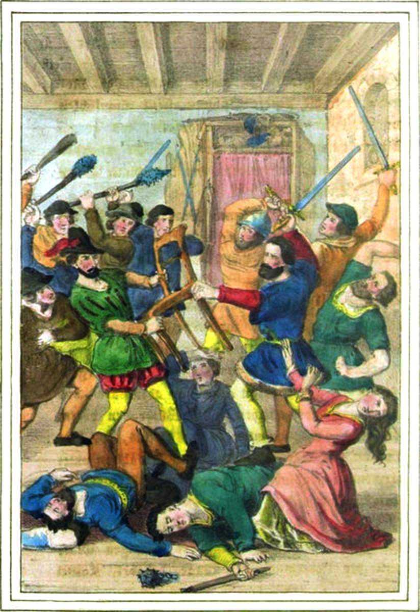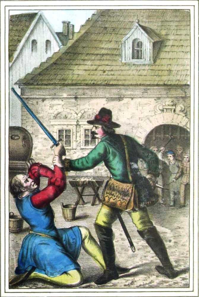 In dem engen Hofraume vor dem Gitterfenster stand ein Mann von gräßlicher Gestalt, die Arme nackt bis an die Schultern, ein blinkendes Beil schwingend über Philipps Haupt, welches von einem Henkerknechte auf einen Block niedergedrückt wurde; nahe an dem Blocke war ein offenes Grab.
