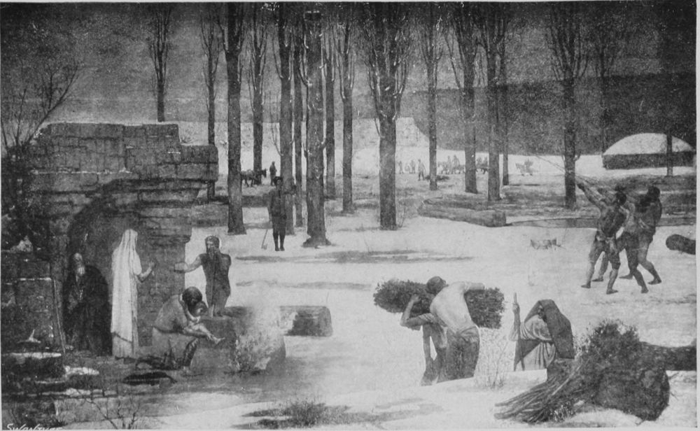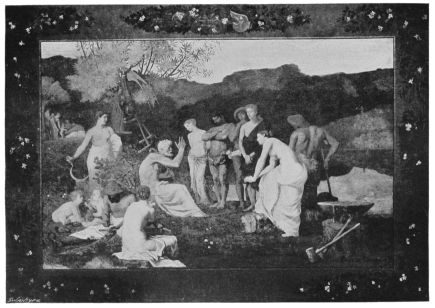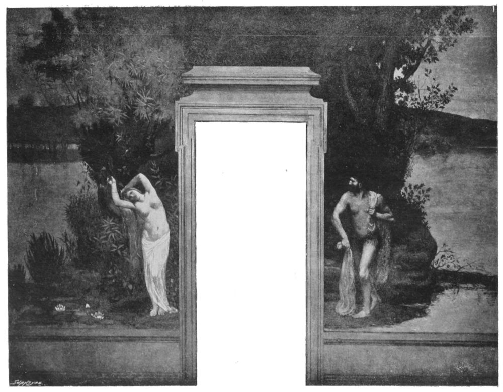His production was enormous, his energy untiring. After months of labour he would go to the seaside, and give himself up to rest and indolence. “In these times I am in despair,” he said, “and feel as though I should never work again. Delightful as is this repose, it is to the days of labour that I look back with the greatest pleasure. It seems as though my power were gone for ever.” This he wrote from Dieppe, where he was digging shrimps in the sand like a boy. He began his studies for the career of an artist late. What other men accomplished and put by he saw fulfilled in his own day. And because of his unusual vigour and fecund power of production he realised in mature years what to others are the dreams of youth. It is this juvenance carried into ripe age that gives a virginal freshness to his painting. His fresco in the Boston Library, as well as the work upon which he was engaged at the time of his death—“The Old Age of Ste. Geneviève,” a new series for the Panthéon—far from suggesting declining power, possess the fresh bloom by which only the young spirit can make beautiful its{30} creations. The painter had reached an apotheosis of power. He had been the product of a country whose times are strange and complex. His land, his race, its blood and tradition generated his genius, and he leaves to it in turn his glory, and the stirring example of his life, at the time of his country’s need, it may be well said; and the relics of his beautiful art will remain, when political crusade, when exaggerated types and schools are past and forgotten.{31}
