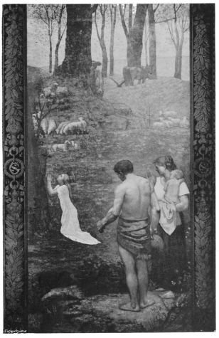 Of his faith or dogma his art, however, tells us nothing definite. The legends of saints are no less breathing evidences of a distinct credo, than the mythical figures in the Vision Antique and other works of the same character are expressions of harmony with the Greek pagan spirit. It is the expansive, all-embracing province of highest art the faith in, the love for Beauty which is the creed of Puvis de Chavannes; and it is the manner in which this inspired genius conceived and presented the forms of Beauty that separated him so vastly from his materialistic forerunners and contemporaries in France.