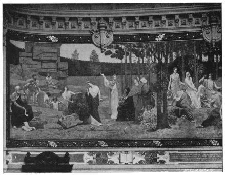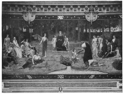 The loves of the shepherds, the follies of Olympus, Greek myths, with little logical bearing on place or object decorated, had been the subjects chosen for the walls and ceilings of public monuments and public buildings. From these uninspired conceptions to the creations of Puvis de Chavannes is a decided transition. His compositions, never fantastic or impossible, are the highest conceptions of the real, as well as visions of{15}