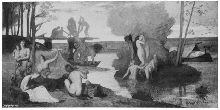 Hitherto, in mural decorations and in frescoes, landscape formed an inferior part; it was a subordinate background, complementary to the figures, unreal, exaggerated, brilliant, glaring. It remained for Puvis de Chavannes to introduce into his frescoes the country of France with its exquisite atmospheric effects; to make rivers, trees, fields, and woods dignified, expressive parts of his composition; as a landscape painter he occupies a place with Corot, Rousseau, Troyon.