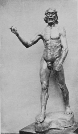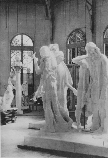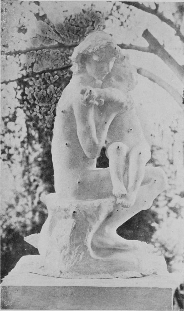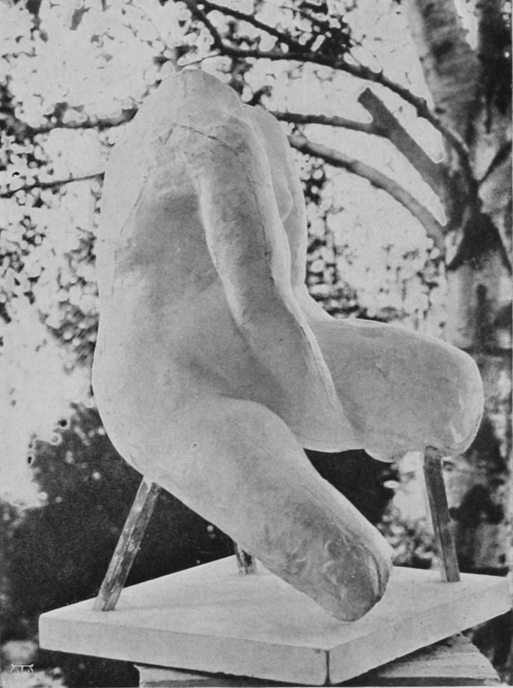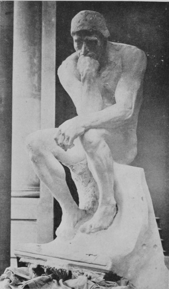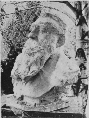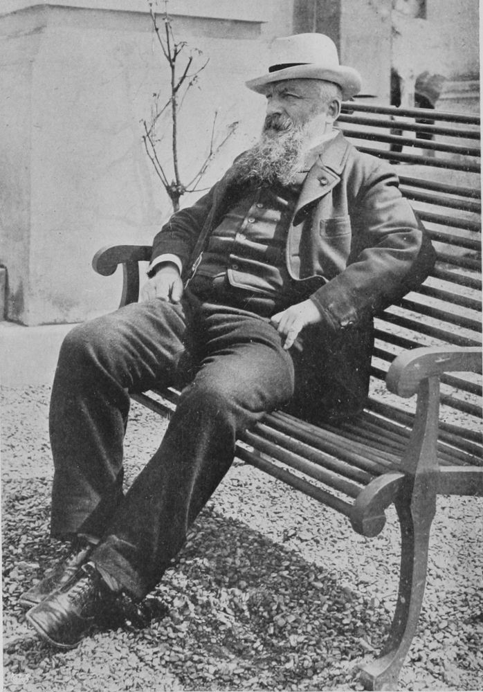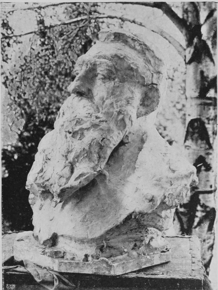 In his studio in the Rue Caulaincourt, walking to and fro, he converses delightfully with his friends. He is a workman, his muscular hands are full of force, his build powerful, although he is compact and small. He suggests endurance, and the patience that is the result of hand-to-hand tussle with existence, and tender understanding of the needs of one’s neighbour. His eyes are keen, penetrating, and kind, his features strong. He has a golden voice, as the French say, caressing and indolent. Its measured cadence, its slow, agreeable flow contrasts strongly with the man himself. He wears the coarse velveteens of the labourer, cuffs close around his muscular wrists. His trousers are voluminous, and on his feet flap loose Indian slippers. His appearance, and the fact that his studio is in one of the poorest quarters of Paris, his whole attitude and life, suggest, not a{189}