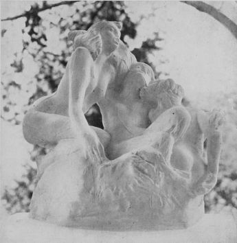 to be joined in wedlock, turn, or on which—from the very position of the picture—their eyes are forced to rest. Directly over the official desk—directly over the entrance door—is the third decoration of the suite. In the frailest tone, if this word may be employed, in the most mysterious medium, he has painted a winter scene. To the left a little row of skeleton trees range in nude, chaste bareness; in the far distance is the lonely outline of a ruined tower. Close together—at the top of a long line of stone steps—are seated a man and woman. Age has claimed them; they are old. But the woman still leans upon the man. What this fresco portrays of union, of inseparableness, of devotion, is not easy to express in words. There is no hint of melancholy in this winter scene, in this study of old age which Besnard has seen fit to accentuate, which he has chosen for his principal panel, and on which the newly married couple must meditate. It is the beautiful apotheosis of wedded love daringly looking beyond youth to the serene beauty of life’s decline. The frescoes were done in 1898. They are drawn at once with freedom and precision, and are excellent examples of the best modern mural art.