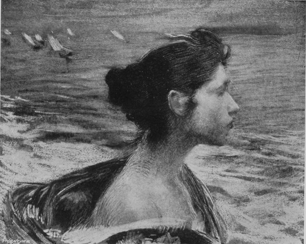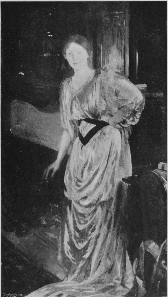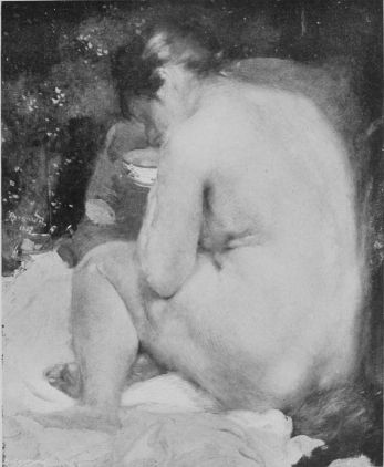 “My method of work is not different to that of the other masters,” Besnard says. “I first make a design in wash and then colour it liberally, put in all the{154} vibration that I see and feel in nature.” (He has chosen his definition happily, Vibration is a distinct quality of his work). “I am really glad you do not think I represent a school! I feel myself a solitary as far as my art goes.... I love motion, and action, and variety, and yet withal I am a dreamer, completely lost in my conception and in my mental preparation for my work. For this reason, perhaps because I am so constantly absorbed in the world of imagination, my taste in literature is for modern things—for immediate things, if I may so say. I rise at seven in the morning, and am at work at nine. I paint until luncheon, and rarely do good work in the afternoons. I take my inspirations, the ideas for my pictures, from everything that surrounds me. I cannot tell from where they come, but I am always seeking to accurately arrange my ideas and render my conceptions and my translations of them harmonious.”