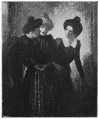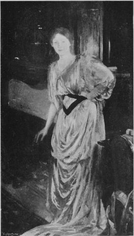 The Musée du Luxembourg is especially rich in the artist’s works, and the buyers for the State have shown wisdom and penetration in their choice. In one of the rooms is a small canvas not over 18 by 6 inches. It recalls in character and distinction the little picture of Gambetta’s room done by Cazin, and it is only the great masters who thus wonderfully fill small bits of canvas with whole histories of life. Besnard has called his study “La Mort”—a miserable little mansard room au sixième in a third-class hotel—the meagre furnishings are a chair, table, and iron bed on which lies the dead figure of a woman. At the door the voluble concierge, half curious and half touched, ushers in a young man, no doubt the lover of the wretched creature beyond all the questions of life; the man is in evening dress, hat in his hand. Here we have poverty, misery, debauch, disgrace and despair in a medallion, as it were. The composition and the treatment recall no one but Besnard himself, but the literary quality of the picture suggests Hogarth series, and Tolstoi and Balzac. This affinity with a sister art is now and then interestingly observed in the narrative pictures of the great masters.{138}