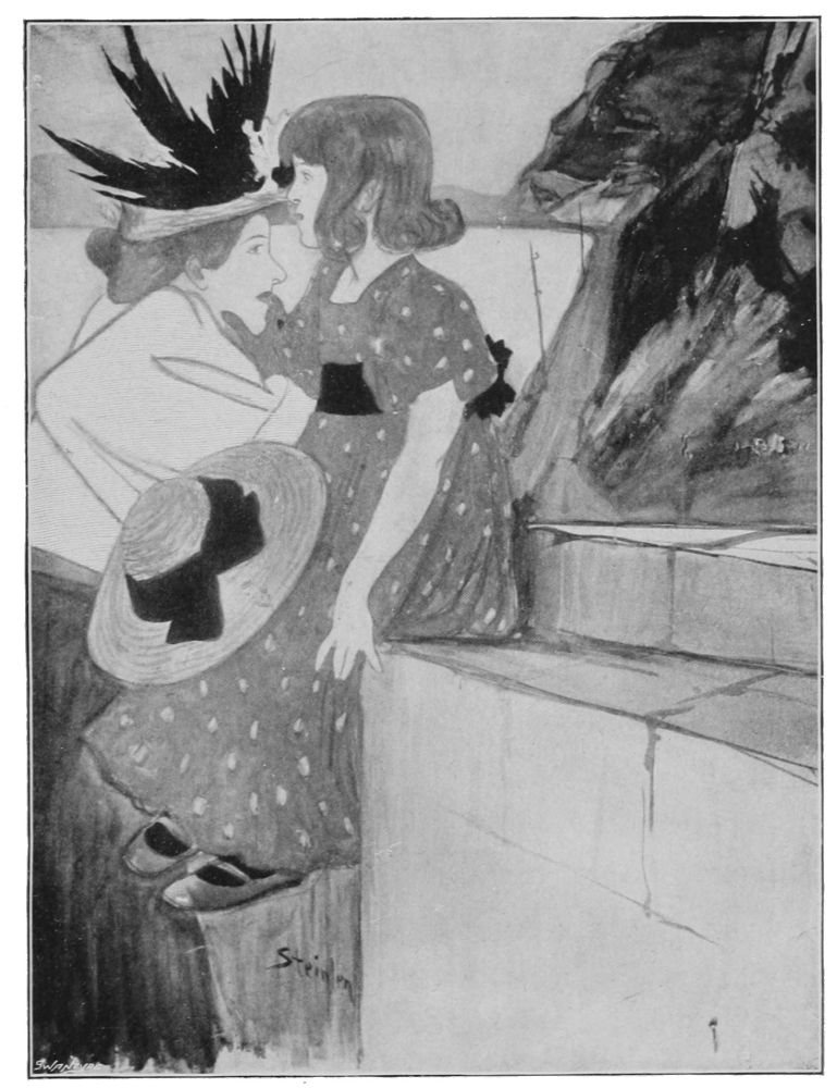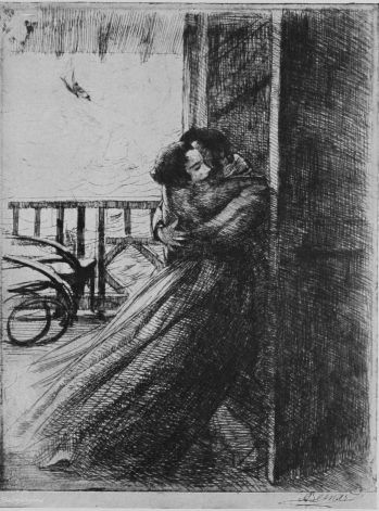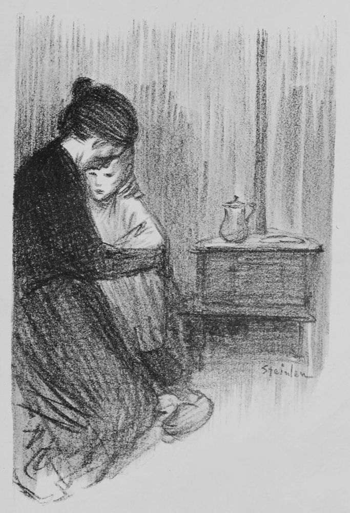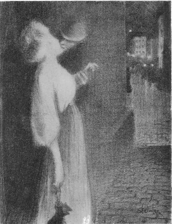 Possibly Steinlen is nowhere better displayed than in a certain canvas at present in his studio in the Rue Caulaincourt. It is a life-size oil painting, a study of a man and woman in the working class. It is evidently the end of the day, and the scene a nook or corner in some room so distant from the rooms we all know that it is hard even to imagine where it may be. The workman has taken the young creature in his arms for a long embrace. His head is bent over her, and she looks out from the picture above the man’s arm. Her face is exquisite, and in thorough keeping with the type of her class.