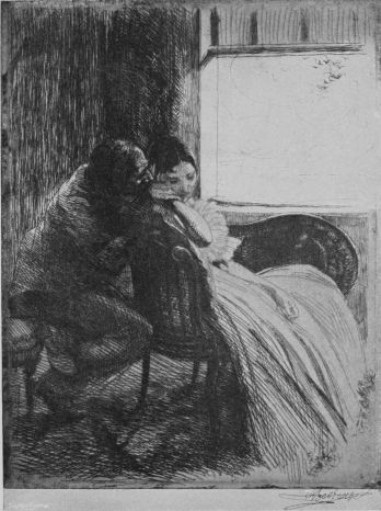 It would not be complete to close the study of Besnard without mention of his etchings. Here and there a dealer may have a complete set of the few produced, but they are few indeed, and difficult to obtain. The most celebrated is known as “La Femme.” In this series Besnard has drawn woman in every stage of her existence. We have the flirt, the mistress, the wife, the happy mother with her children, the miserable mother, who to cover the form of her freezing child denudes herself, and at length casts her body over her son; the woman of the ball-room, the woman of the streets, and, in short, he has seen fit to{150} display every state and condition of femininity in this study of black and white.