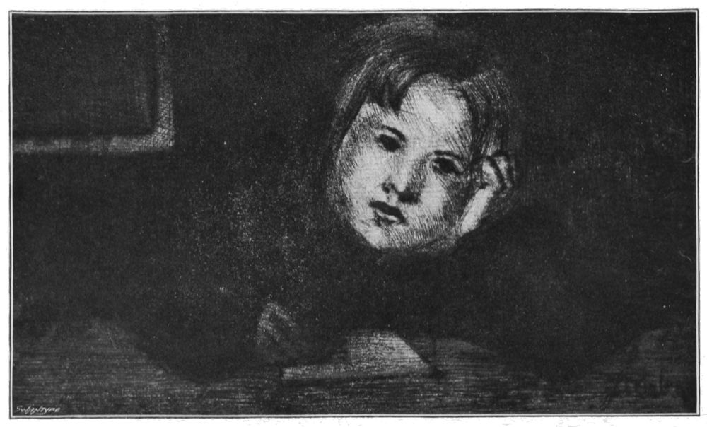 a table drinking a bowl of milk, under the jealous eyes of three great cats. The child is Steinlen’s little daughter, and the drawing of child and cats is as skilful and clever as it well can be.