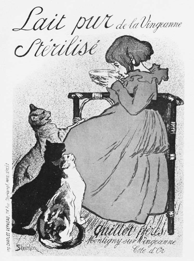 It was in the early part of his career that he added to the glory of the modern poster. Artists of distinction in London and Paris have not hesitated to employ their talent in street-wall decoration. In France, Steinlen has many rivals amongst favourite painters of the day, most notably Léandre, Willette, Cheret. But the Steinlen posters have not been surpassed nor superseded. They are immensely popular, peculiarly happy.