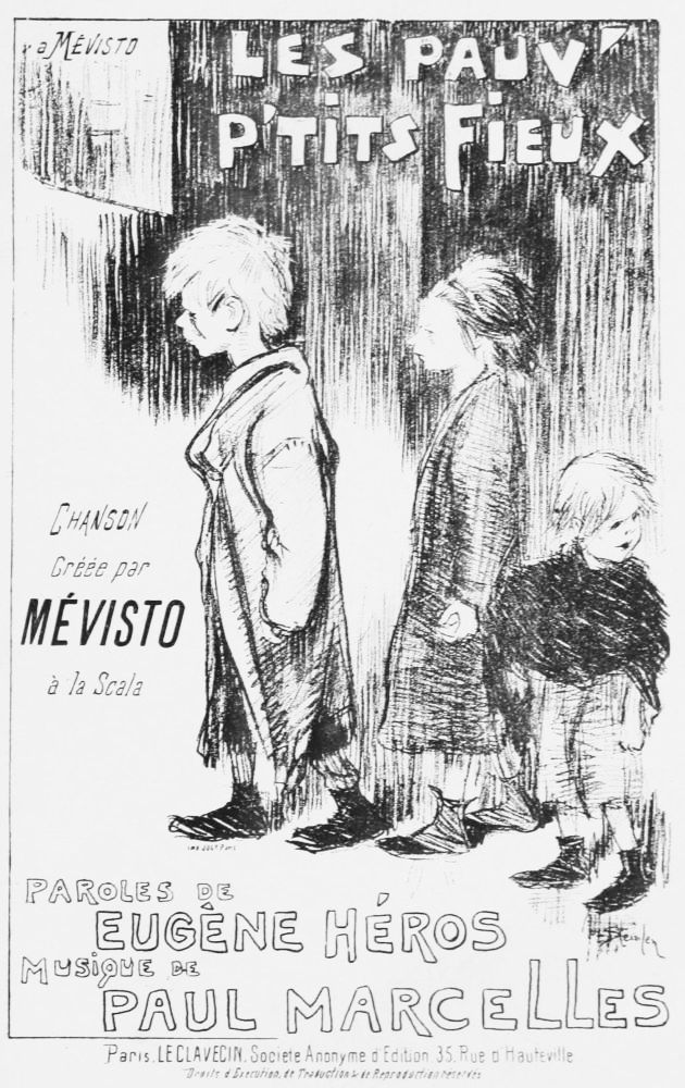 For the most part the illustrations in Gil Blas are coloured. They are satires on life drawn to accompany some “Saut d’esprit” or to portray simply street scenes{168} as Steinlen knows them, or are political cartoons. In his street studies he has been relentless in his realism, careless of how unpleasant may be the impression of these frankly told horrors. No detail of sordid existence has been neglected in his bold depicting of the city’s misery.