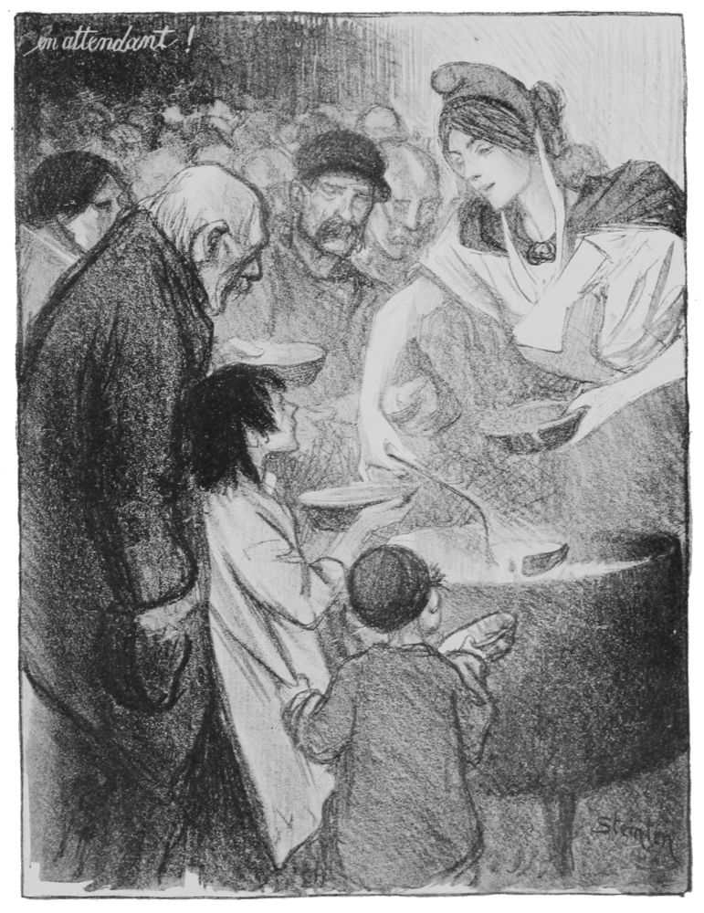 Part of the crowd, elbow to elbow with humanity in the very vortex of the mass, he has felt the multitude, blood and sinew, around him, until it has become amalgamated fairly with his inspiration. Then withdrawn to a fortification, possibly, of his city, in semi-retirement, he lets the turbulent suggestions take form that he may present them to the world. Thus Steinlen, so closely of the people, is in reality separated from mankind by virtue of his talent. And if to the eye demanding agreeable form, beauty seems sometimes lacking in this artist’s strong, original, profoundly human creations, it may be said that æsthetics do not abound in the walks of life which this student of humanity portrays.