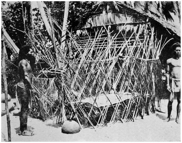 “I was aroused before daybreak the next morning by the now familiar war-cries of natives; and the sentries were speedily reinforced by a line of police at each end of the spur upon which we were camped, prepared to repel a rush. The hour just before dawn appears to be a favourite time for an attack amongst Papuans, and we found evidence afterwards that these natives had camped for a portion of the night in some numbers in the scrub at the edge of the clearing, and had denied themselves the comfort of a fire, so that their presence might not be disclosed, making small shelters of branches to protect them from the chill mountain air. They evidently intended to take us by surprise, and to rush our camp, but finding it so well guarded and no doubt feeling very cold, their spirits failed them and they contented themselves with loud challenges, threats, and blowing of war-shells, which were responded to, I have no doubt, in equally uncomplimentary language by our police and carriers. We could314 hear them moving in the undergrowth, but they wisely refrained from emerging into the clearing. Mr. Bruce fired at a dark form in the dim light, and after continuing their warlike demonstrations for some little time longer, they retreated when the first streaks of dawn began to appear.