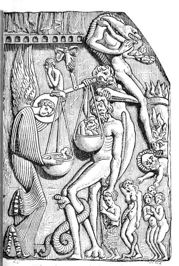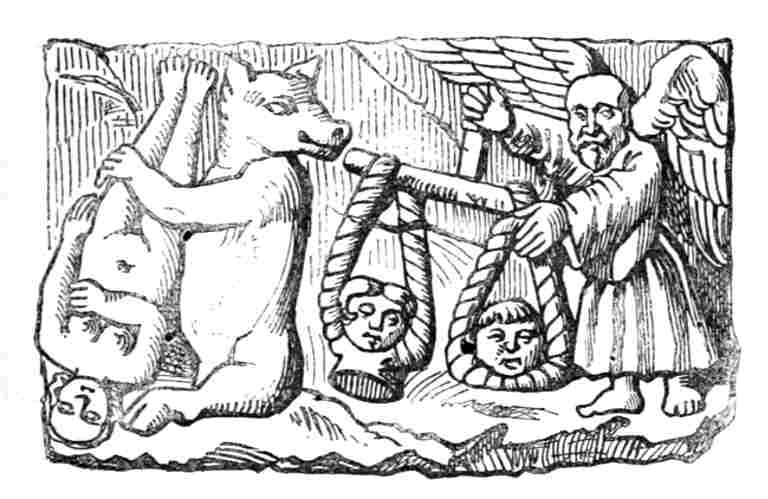 Ce sont des corps humains surmontés de têtes d'animaux, des têtes de nature équivoque, des diables soufflant à plein gosier le feu sous d'énormes chaudières, des damnés emportés par des chevaux fougueux, des femmes dont les parties sexuelles sont dévorées par des démons, des animaux prêchant en chaire, de sauvages cavaliers traînant à la queue de leurs chevaux des malheureux dont le ventre déchiré laisse passer les entrailles, des dragons dont la gueule grimaçante vomit l'eau des gouttières, des singes couverts de frocs, des têtes d'hommes demi-fous, demi-prêtres, de grandes dents et de plus grandes bouches encore qui avalent[Pg 25] des gens tout entiers, des bêtes touchant de l'orgue, des faunes grimaçants qui narguent les fidèles, des victimes que des démons empalent sur de longues broches, des ânes qui braient en pinçant de la lyre.