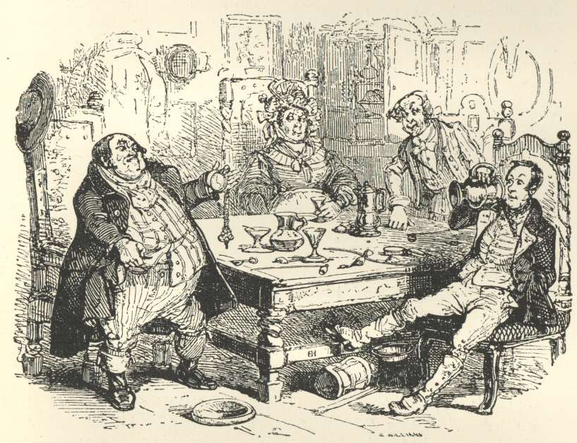Not confining himself to a mere verbal description of his grandson’s abilities, Mr. Weller, when tea was finished, invited him by various gifts of pence and halfpence to smoke imaginary pipes, drink visionary beer from real pots, imitate his grandfather without reserve, and in particular to go through the drunken scene, which threw the old gentleman into ecstasies and filled the housekeeper with wonder.  Nor was Mr. Weller’s pride satisfied with even this display, for when he took his leave he carried the child, like some rare and astonishing curiosity, first to the barber’s house and afterwards to the tobacconist’s, at each of which places he repeated his performances with the utmost effect to applauding and delighted audiences.  It was half-past nine o’clock when Mr. Weller was last seen carrying him home upon his shoulder, and it has been whispered abroad that at that time the infant Tony was rather intoxicated. [306]