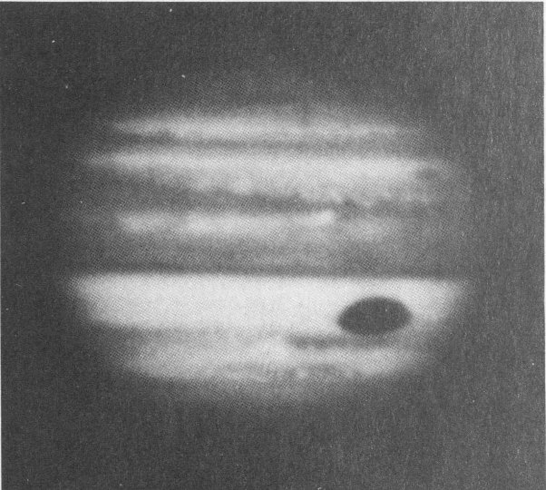 The major features of Jupiter are shown in schematic form. The planet is a banded disk of turbulent clouds; all its stripes are parallel to the bulging equator. Large dusky gray regions surround each pole. Darker gray or brown stripes called belts intermingle with lighter, yellow-white stripes called zones. Many of the belts and zones are permanent features that have been named. One feature of particular note is the Great Red Spot, an enigmatic oval larger than the planet Earth, which was first seen more than three centuries ago. During the years the spot has changed in size and color, and it escaped detection entirely for nearly fifty years in the 1700s. However, since the mid-nineteenth century the Great Red Spot has been the most prominent feature on the face of Jupiter. [2935]