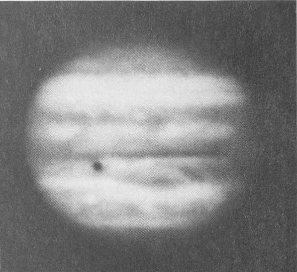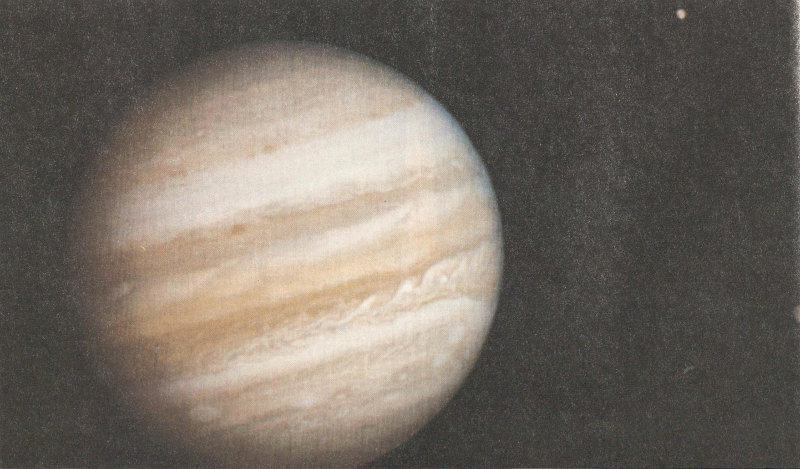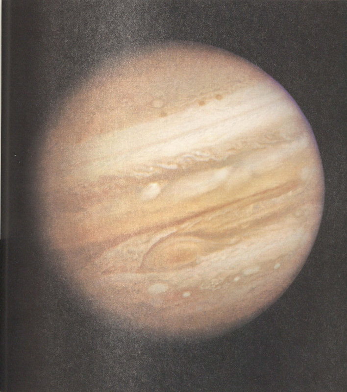 In the Sun’s necklace of planets, one gem far outshines the rest: Jupiter. Larger than all the other planets and satellites combined, Jupiter is a true giant. If intelligent beings exist on planets circling nearby stars, it is probable that Jupiter is the only member of our planetary system they can detect. They can see the Sun wobble in its motion with a twelve-year period as Jupiter circles it, pulling first one way, then the other with the powerful tug of its gravity. If astronomers on some distant worlds put telescopes in orbit above their atmospheres, they might even be able to detect the sunlight reflected from Jupiter. But all the other planets—including tiny inconspicuous Earth—would be hopelessly lost in the glare of our star, the Sun.