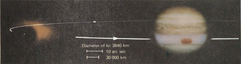 The exact launch date and trajectory for Galileo have not yet been specified, but if all goes well, the Orbiter spacecraft will approach Jupiter from the dawn side of the planet sometime in the mid-1980s. It will not be moving as fast as Voyager, since it must be placed into orbit around Jupiter rather than flashing past on its way to the outer solar system. On its initial trajectory, Galileo will probably come within 5 RJ of Jupiter, slightly closer than Voyager 1. At this time it will fire its rocket engines (supplied by the Federal Republic of Germany in a cooperative program with NASA) to shed excess speed and let itself be captured by Jupiter’s gravity. The first pass will also be the time for a close flyby of Io.