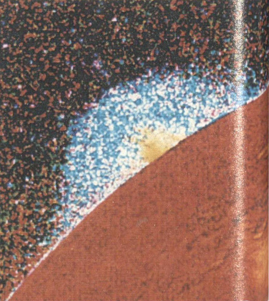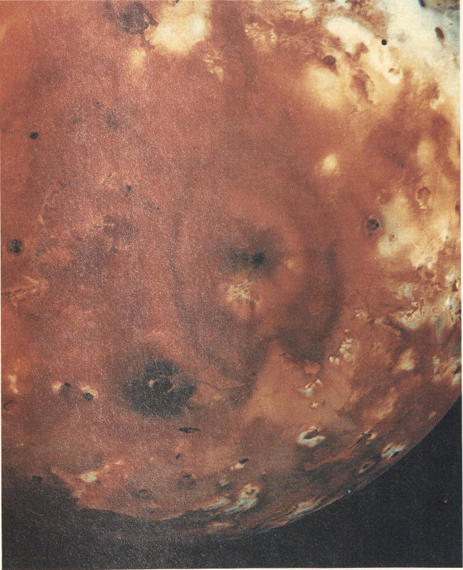 A special color reconstruction of the eruption of the volcano Loki on the Jovian satellite Io. The picture was taken by Voyager 1 from a range of about half a million kilometers. [P-21334C]