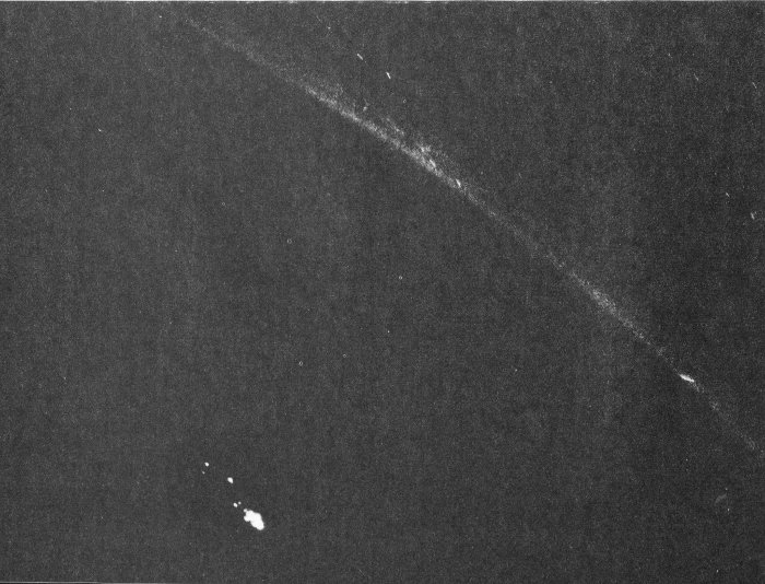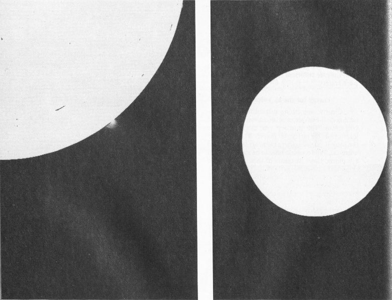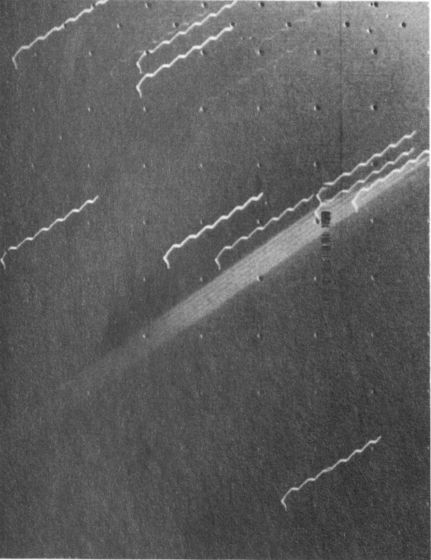 This image of Io’s extended sodium cloud was taken February 19, 1977, at the Jet Propulsion Laboratory’s Table Mountain Observatory. A picture of Jupiter, drawings of the orbital geometry, and Io’s disk (the small circle on the left) are included for perspective. The sodium cloud image has been processed for removal of sky background, instrumental effects, and the like. This photograph demonstrates that the cloud is highly elongated and that more sodium precedes Io in its orbit than trails it. [P-20047]