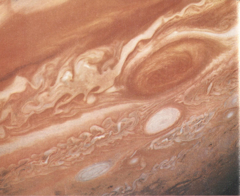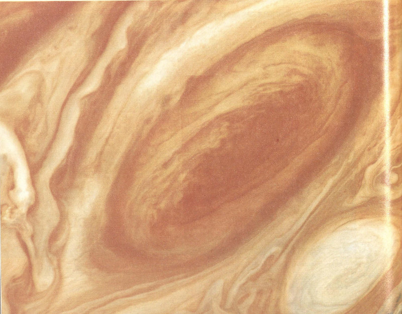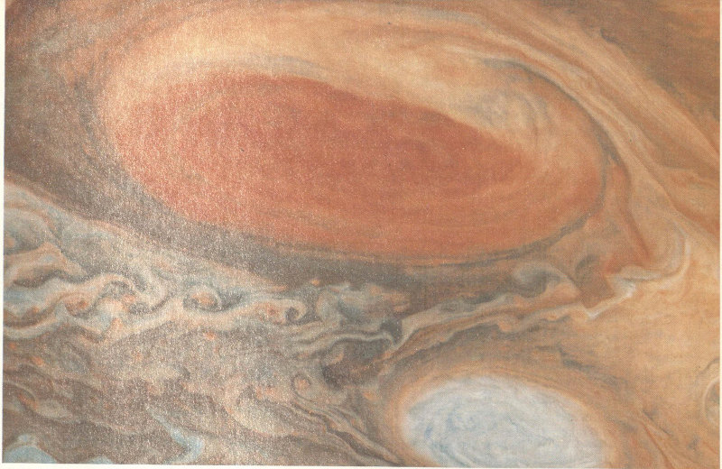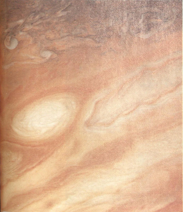 Although the face of Jupiter is always changing, some spots and other cloud features survive for years at a time, much longer than do the largest storms on Earth. The record for longevity goes to the Great Red Spot. This gigantic red oval, larger than the planet Earth, was first seen more than three centuries ago. From decade to decade it has changed in size and color, and for nearly fifty years in the late eighteenth century no sightings were reported, but since about 1840 the Great Red Spot has been the most prominent feature on the disk of Jupiter.
