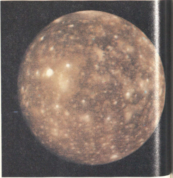 Callisto, the outermost Galilean satellite, is larger than the planet Mercury. It also has the lowest reflectivity, or albedo, of the four, suggesting that its surface may be composed of some rather dark, colorless rock. Callisto takes just over two weeks to orbit once around Jupiter.