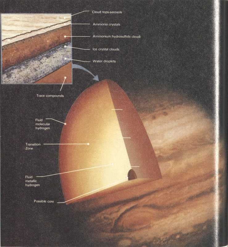 In the 1940s and 1950s the German-American astronomer Rupert Wildt used all the available data to derive a picture of Jupiter that is still generally accepted. He noted that both the low total density and the observed presence of hydrogen-rich compounds in the atmosphere were consistent with a bulk composition similar to that of the Sun and stars. This “cosmic composition” is dominated by the two simplest elements, hydrogen and helium, which together make up nearly 99 percent of all the material in the universe. Wildt hypothesized that the giant planets, because of their large size, had succeeded in retaining this primordial composition, whereas the hydrogen and helium had escaped from the smaller inner planets. He also used his knowledge of the properties of hydrogen and helium to calculate what the interior structure of Jupiter might be like, concluding that the planet is mostly liquid or gas. Wildt suggested that there probably was a core of solid material deep in the interior, but that much of Jupiter is fluid—extremely viscous and compressed deep below the visible atmosphere, but still not solid. The atmosphere seen from above is just the thin, topmost layer of an ocean of gases thousands of kilometers thick.