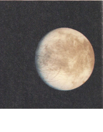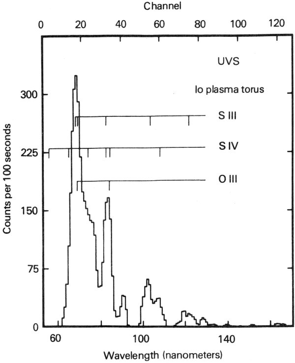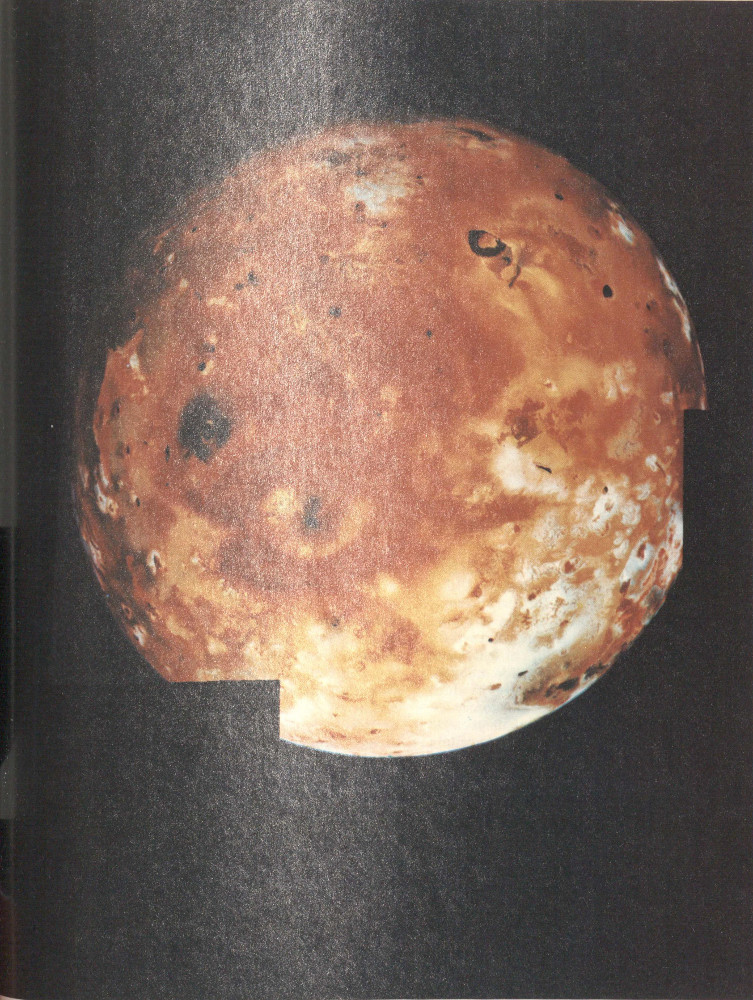 Io, innermost of the Galilean satellites, is the same size as our Moon. It orbits the planet in 42 hours, half the period of Europa. Like Europa, it has a very high reflectivity, but, unlike Europa, it has no spectral absorptions indicative of water ice. Before Voyager, identification of the surface material on Io presented a major problem to planetary astronomers.