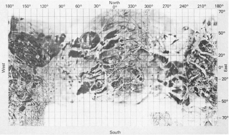 This map was compiled from Voyager 1 and 2 pictures of Ganymede. Placement of features is based on predicted spacecraft trajectory data and is highly approximate. The linkage between Voyager 1 and Voyager 2 pictures is particularly tenuous. Placement errors as large as 10° are probably common throughout the map, and a few may be even larger. A large unresolved discrepancy exists in the area bounded by the -45° and -55° parallels between 120° and 180° longitude. Relative placement of features is distorted in that area. Feature names were approved by the International Astronomical Union in 1979. Airbrush representation is by J. L. Inge.