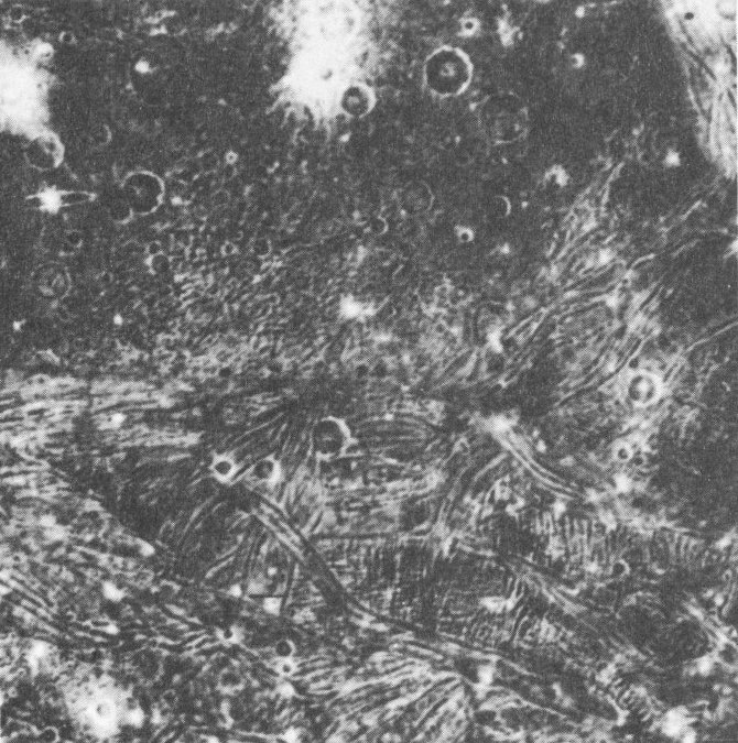 Although the presence of a gas can usually be inferred from spectroscopy, solids or liquids cannot normally be detected in this way. Thus the composition of Jupiter’s clouds could not be determined directly. However, the presence of ammonia gas provided an important clue. At the temperatures expected in the upper atmosphere of the planet, ammonia gas must freeze to form tiny crystals of ammonia ice, just as water vapor in the Earth’s atmosphere freezes to form cirrus clouds. Most investigators agreed that the high clouds covering much of Jupiter must be ammonia cirrus. But ammonia crystals are white, so the presence of this material provides no explanation for the many colors seen on Jupiter. Additional materials must be present—perhaps colored organic compounds, produced in small amounts by the action of sunlight on the atmosphere.