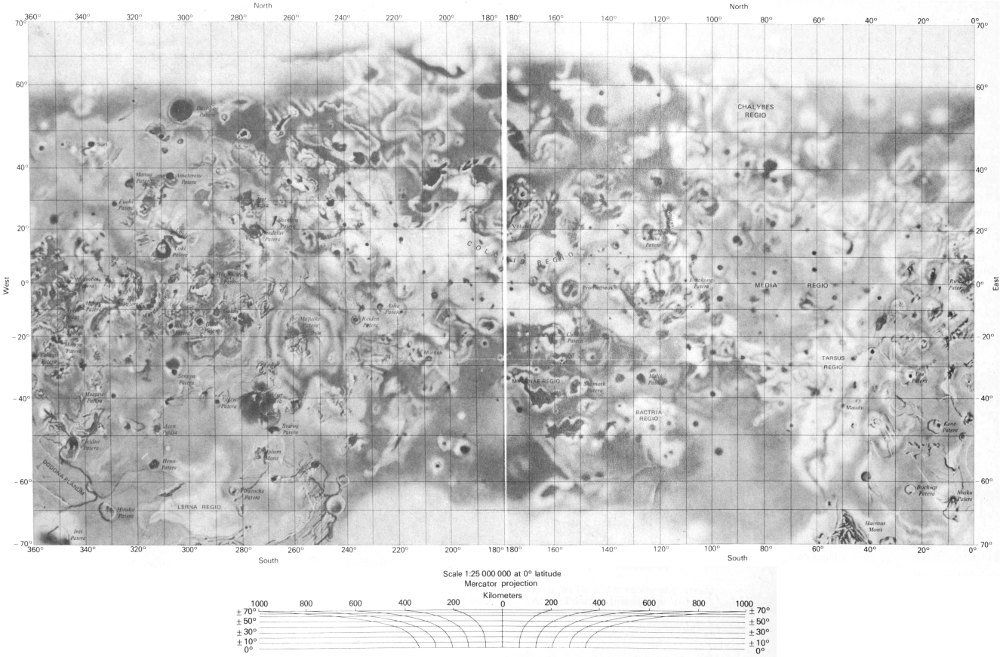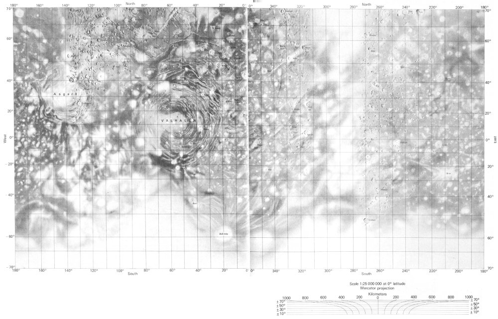 This map was compiled from Voyager 1 and 2 pictures of Callisto. Placement of features is based on predicted spacecraft trajectory data and is highly approximate. The linkage between Voyager 1 and Voyager 2 pictures is particularly tenuous. Placement errors as large as 10° are probably common throughout the map, and a few may be even larger. Feature names were approved by the International Astronomical Union in 1979. Airbrush representation is by P. M. Bridges.