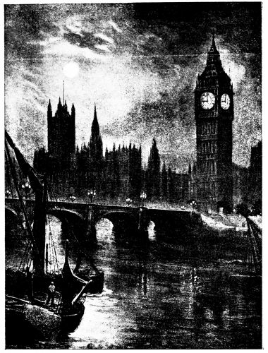 As the crowd poured out we crossed the courts once again under the moonlight, everything still and remote, the great Tower of the Abbey dimly outlined, the huge Victoria Tower beetling over all, the many clocks, St. Margaret’s, the Abbey, “Big Ben,” and others of smaller degree, chiming vigorously one against the other. Ashburnham House, fast closed, was sleeping placidly in the moonlight. We passed the slow, old-fashioned rooms of the Head Master, where there was a cheerful restorative supper, not at all unwelcome after the long course of rather perplexing Latin, where the guests were hospitably entreated by this cordial host.{15}