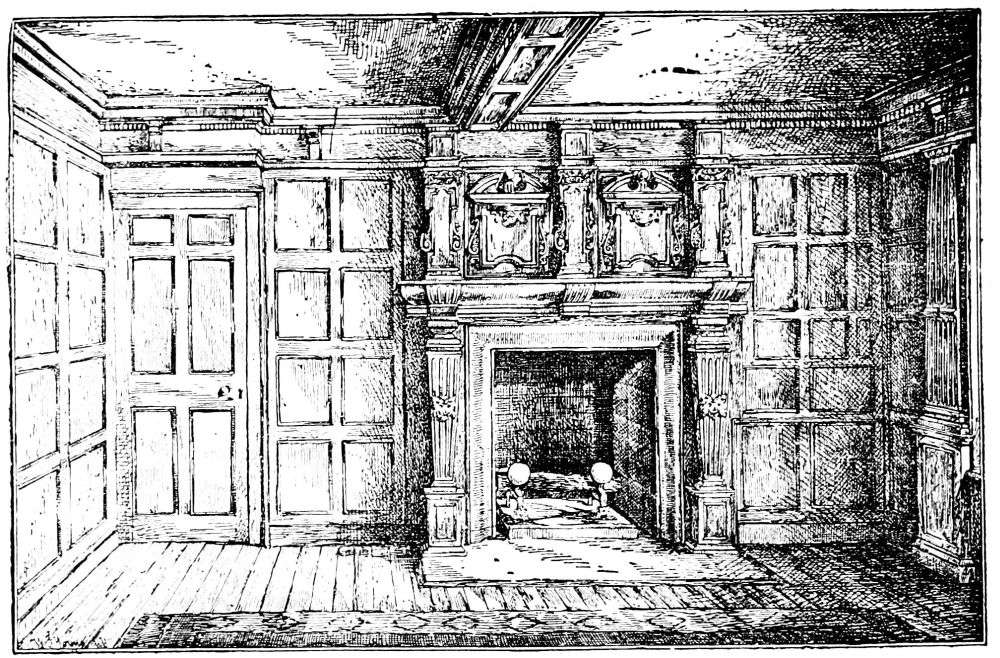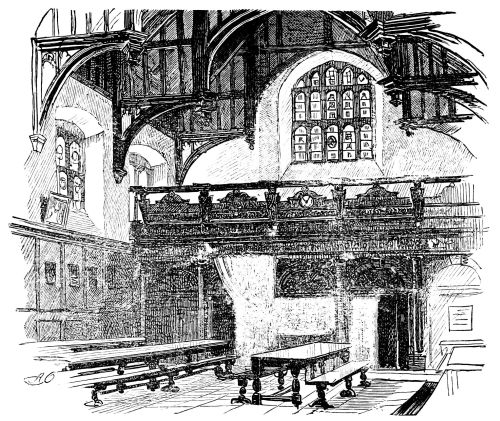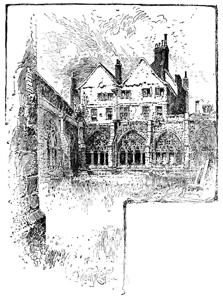 The charming way in which the few remaining rooms—all that are left—open off the landing, is another of the attractions of this gem, about whose future one feels a little anxious. There is no doubt it is in a precarious state, if not rickety, and is unsuited for the requirements of the school which is carried on there. The landing might be a room itself, so airily is it treated; quite in keeping, too, is the view from the windows, original in its way, unsuspected perhaps by those familiar with the ordinary aspect of the old Abbey; for there rises before us the grim old and much-neglected flank of the fane, with its mouldering buttresses and decayed windows, which the restorers have, fortunately, not thought worthy of their attention, as being too retired to meet the public eye. Some judicious restoring, cleaning, and repairing might be expended on the old house, which has an air of slight dilapidation. The present general tone of white certainly adds to the effect of lightness, and it is questionable whether the effect would be improved by exposing the old oak panelling.