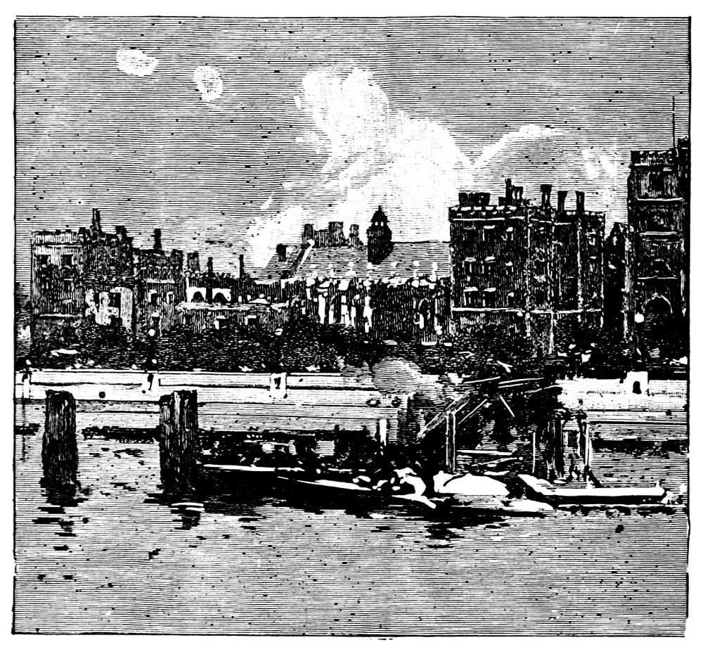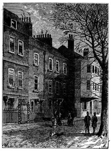 On passing out at the other end of Dean’s Yard, we find ourselves in a tranquil, old-fashioned street, College Street. This might be a portion of a close in an old cathedral, so placid and silent is it; the houses being of that small, unpretending order in which canons and choristers might reside. There are carved doorways, there is cheerful red brick, while a few houses are overgrown from top to bottom with a rich clothing of greenery. At the end we have a glimpse of the river and barges passing lazily by. In front stretches the old cobble wall of the Abbey gardens, full of old trees: the iron-grey walls of the schoolhouse, capped with the old richly-cut cornice, are seen within, Lord Burlington’s work—while over all rises the huge and solemn tower, the great Victoria—offering quite a suggestion of Canterbury Cathedral. In the wall are little unassuming portals, with the name of a canon or two inscribed on them, and cart or carriage rarely disturbs the solitude. In short there is scarcely anything in town more grateful, or more in tone with the Abbey itself than this little street, or indeed the region in which it is. Taken with the Cloisters, the old houses and little courts in the Dean’s Yard, and the School Square and Ashburnham House, all is perfectly in keeping.