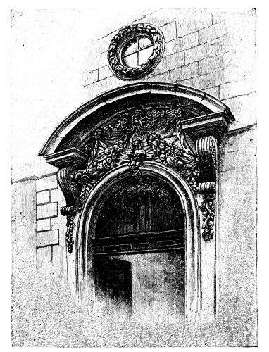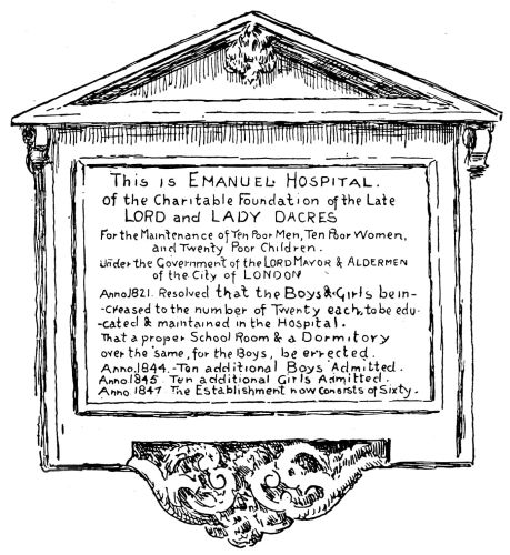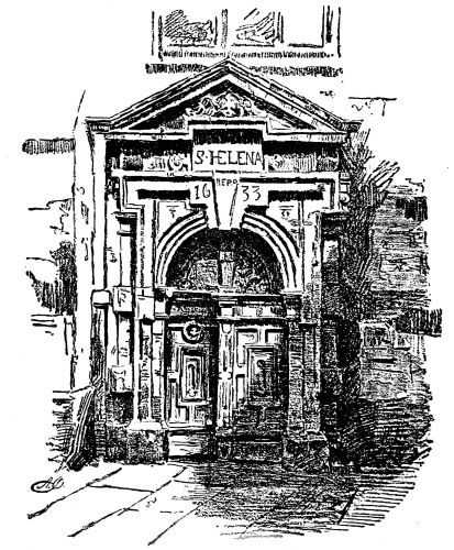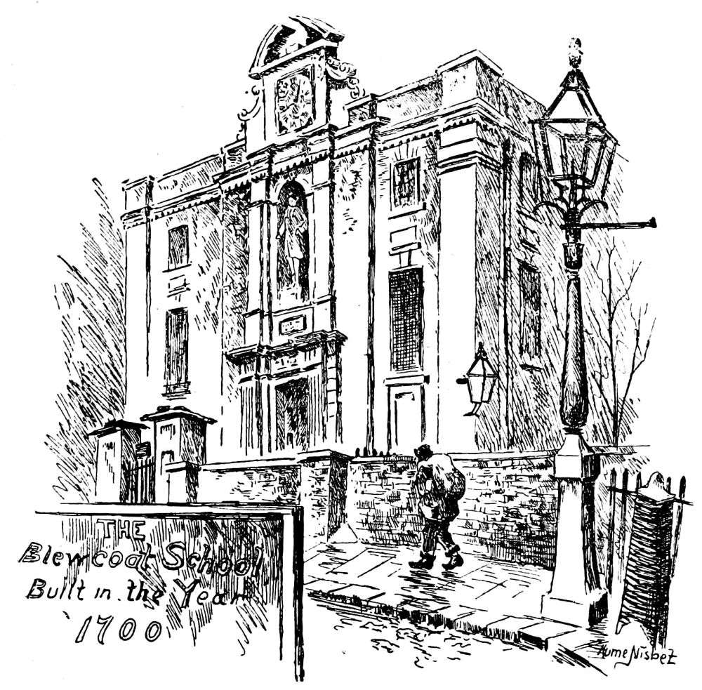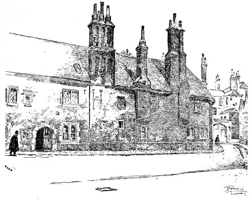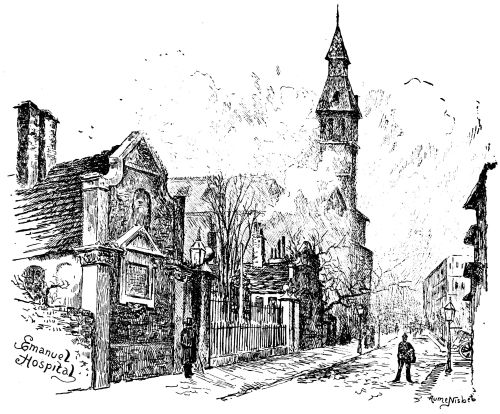 the way of antique survival. Yet here we come on at least three interesting old edifices—almshouses and schools—which in their aspect and surroundings offer a charming sort of surprise. Passing out of Victoria Street, where there is much crush and noise at “The Stores,” and down a small alley, we come to a little gem of its kind, as it will seem to the true artist, a small charity school, standing in its walled inclosure. It is of Queen Anne date and pattern, and is no more than a simple square little hall. But how quaint and varied is it! how admirably are its surfaces broken! while every side offers a different pattern. The honest brick is of a fine plum colour; the wall is daintily divided by pilasters; delicate, unobtrusive cornices run around; the windows are shaped in proportion, and the four doorways are of such varied elegance that it is difficult to decide between them. The whole approach in front, the gateway and its piers, iron work, the flight of steps, the door itself—all strike one as being the work of a tasteful artist. Over the door is the pleasantly rococo figure of “The Blew Coat Boy” in his niche. There is a little garden behind, with steps leading down, and a sort of dédendance attached, similar in style, but acting as a kind of foil. There is a charm about the little unpretentious building that is extraordinary. Unhappily it needs repair and restoration, though it is not{20} dilapidated. No one, however, seems to care for it, and a builder has been allowed to construct a sort of “lean to shed” beside it. By-and-by it is likely enough to pass away and to be swept off so coveted a piece of ground. All who appreciate the grace and charm of architecture must admire it.