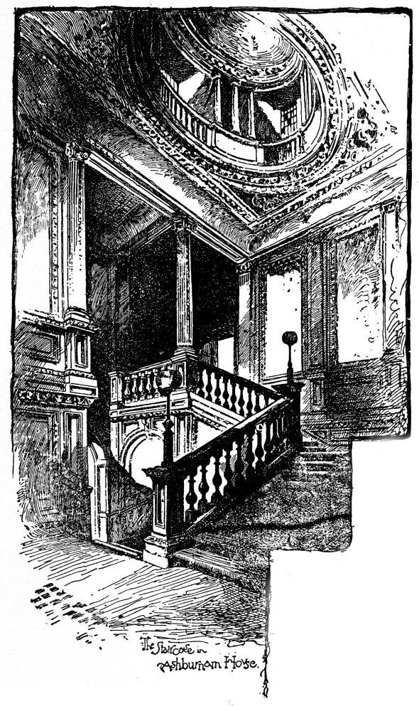 PASSING from Dean’s Yard, through a Gothic arch which leads through the Canons’ houses, we find ourselves in a large court, round which run the old buildings of the Westminster School and its familiar dormitory. Facing the school is a low building, within an inclosure, known as Ashburnham House, an old Tudor structure of much interest, which a few years ago was in serious peril. The valuable ground was coveted, and it was proposed to level it and erect large modern buildings in its stead. Happily public interest was aroused, pictures and sketches appeared in the illustrated papers, and the plan was arrested. The interest lay in the beautiful and elegant design of its interior, which though of modest scale is so exquisitely laid out and designed as to suggest an air of spaciousness. There is no doubt that it is the work of Inigo Jones, who is also credited with having designed the older dormitory of the school. On entering, a low hall presents itself, with a door facing us, through which can be seen a glimpse of the old garden behind.