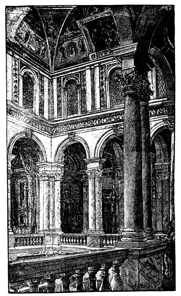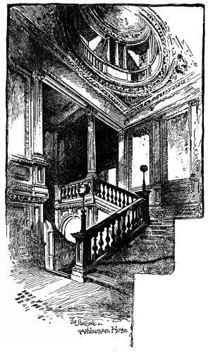 Standing in the airy hall, which though of small size yet appears spacious, and is panelled round with delicately indicated mouldings, we see on the left a low arch over a slightly inclined stair of three or four steps, and beyond which the regular stair with its balustrade is seen. This of itself offers a highly original effect. The staircase itself has the most gentle ascent. The walls, generally white, are broken up by delicate mouldings and pilasters crowned at the top by an oval lantern of elegant shape, and there is a general architectural effect produced of the most pleasing kind. Neither is there anything elaborate, nor are the surfaces too much loaded. We feel that the groundwork is panelling, and therefore only suited to the lightest treatment. With the mouldings are combined stucco tracery of the best school.