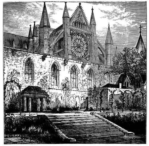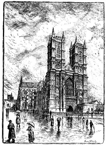 People often lament that the old Cathedrals, both in England and abroad, are so crowded up, and incrusted by mean buildings and streets; but do they gain when these are cleared away? One of the most picturesque glimpses of the Abbey is to be obtained from a point vis-à-vis to the Peers’ entrance, near the equestrian statue. There is a perfect old-world charm over this little corner, at the end of which the great arched buttress of the Chapter House—a happy bit of restoration—shows itself. The air of repose and tranquillity is extraordinary. You would think you were in an old rural town.