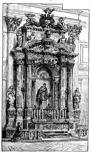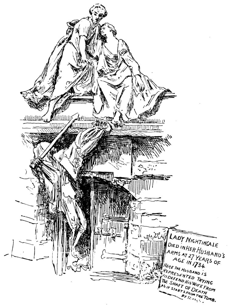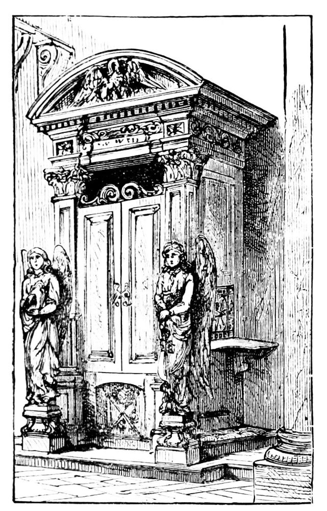 In the shadow of Westminster Abbey stands a homely-looking edifice of Churchwarden’s Gothic. Uninviting as is the exterior of St. Margaret’s, its interior is most interesting and suggestive. Restored not many years ago with excellent taste and reserve, it has been gradually beautified under the direction and encouragement of the rector, Archdeacon Farrar; so that, small and unpretending as it seems, a couple of hours may be profitably spent in viewing it. The interior is of the collegiate pattern, with a flat panelled roof supported by airy and elegant columns with delicate mouldings. The walls have been judiciously allowed to display the outlines of their stones, which furnish good detail and background. No church of its size, perhaps, is so rich in tombs and tablets, all of which are more or less interesting; and they are disposed so as to heighten the general effect. Some are fitted on to the light columns, shield-like, and bent to the mouldings. Most of the memorials are of one formal kind; a bust or medallion in the middle, a pediment above, and below a black marble slab or tablet with the inscription. The marbles are mostly of rich russet tones, or of a plum tint.