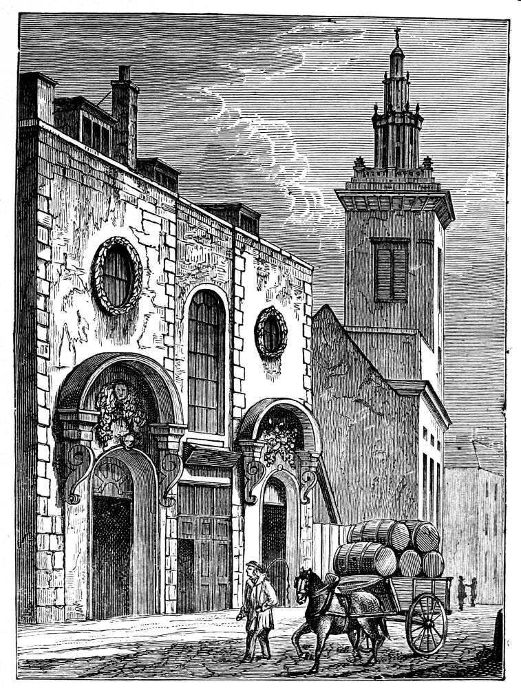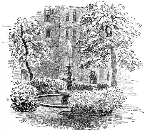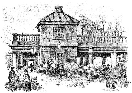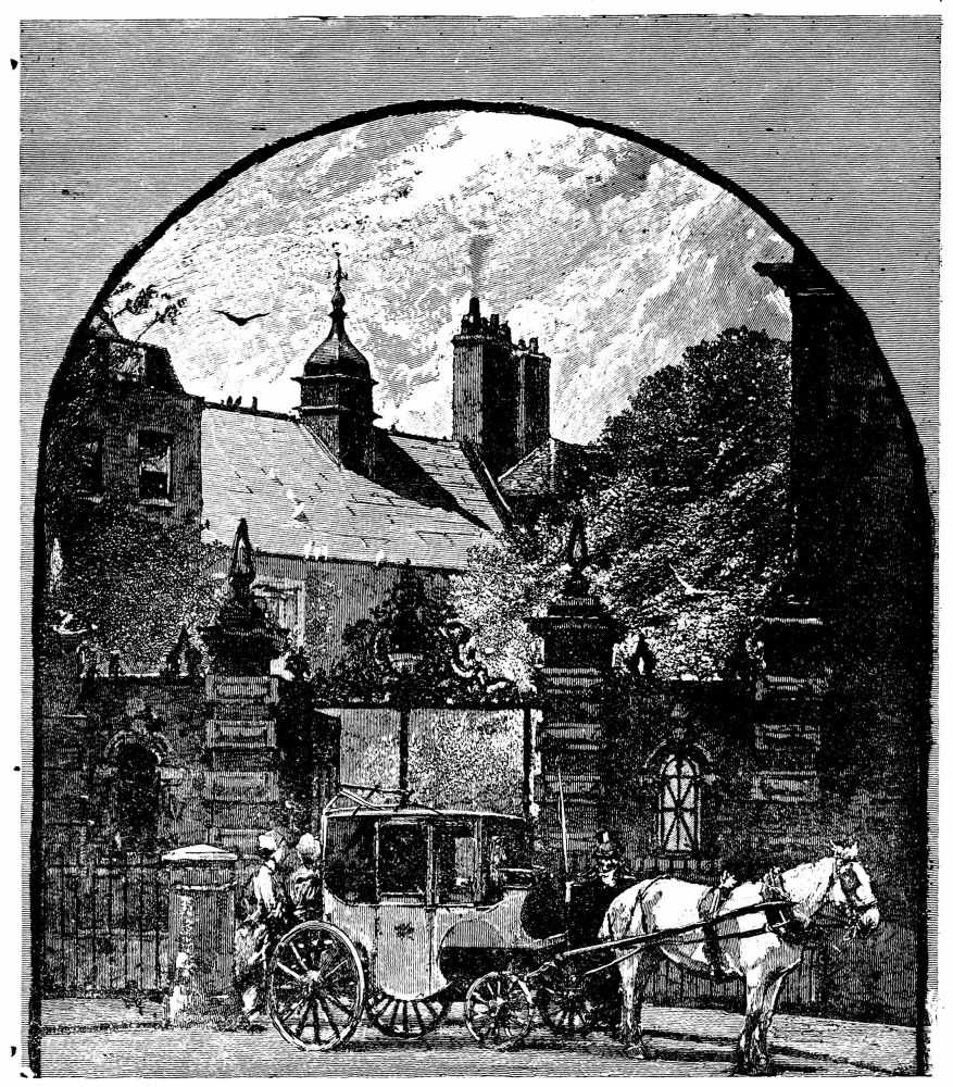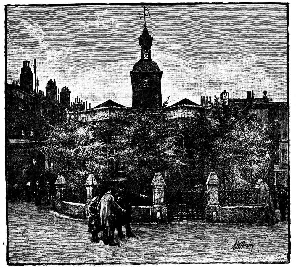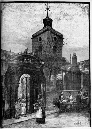 Passing by this interesting structure and walking down a little farther in the direction of James Street, we come to a bit of almost rural life—a perfect picture, which few would suspect could be found so close to the busy haunts of men. This is a group of old almshouses known as Lady Dacre’s—a large square, covered on three sides by the buildings. They are exactly of the pattern that would have delighted the late Frederick Walker, and might be found in the outskirts of some old country town. In front there is a high railing of good old florid iron, with a handsome gateway in the middle. Through the rails we can see the forlorn garden, offering an air of “large desolation” and neglect, with a look of tranquil abandonment. In the centre there is a low block of buildings with a quaint cupola, or lantern, rising over a pediment filled with decayed sculptures. At the side are two pretty little gates by which you can enter and walk round, and play “the contemplative man,” past the low doorways, over each of which are faint characters with the name of a parish. A dim-faced clock gives hoarse and wheezy note of time; but there is no one to be seen.